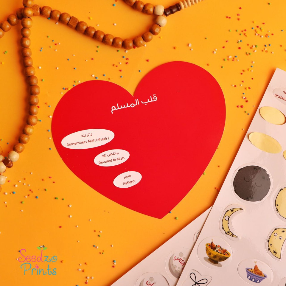اجعل طفلك يبحث في ورقات الملصقات عن صفات قلب المسلم السليم ثم يلصقها داخل القلب